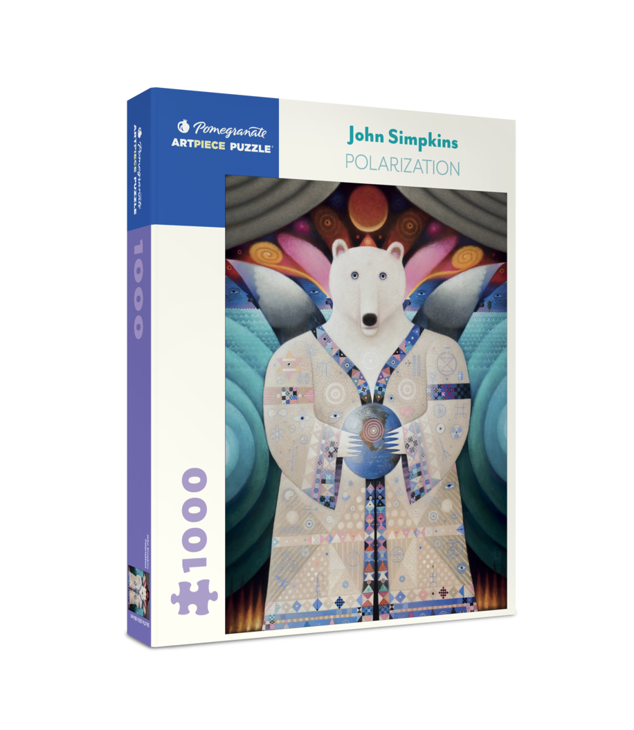 John Simpkins (American, b. 1951) Polarization, 2015 Animal and human, light and dark, earthly and spiritual, John Simpkins’s artwork is a study in contrasts and comparisons, and the edges between them. Simpkins is the sole human resident of an Oregon ghost town at the edge of Steens Mountain and the Alvord Desert. This 1000-piece jigsaw puzzle features a magical polar bear, replete with symbols and radiating a calming presence.