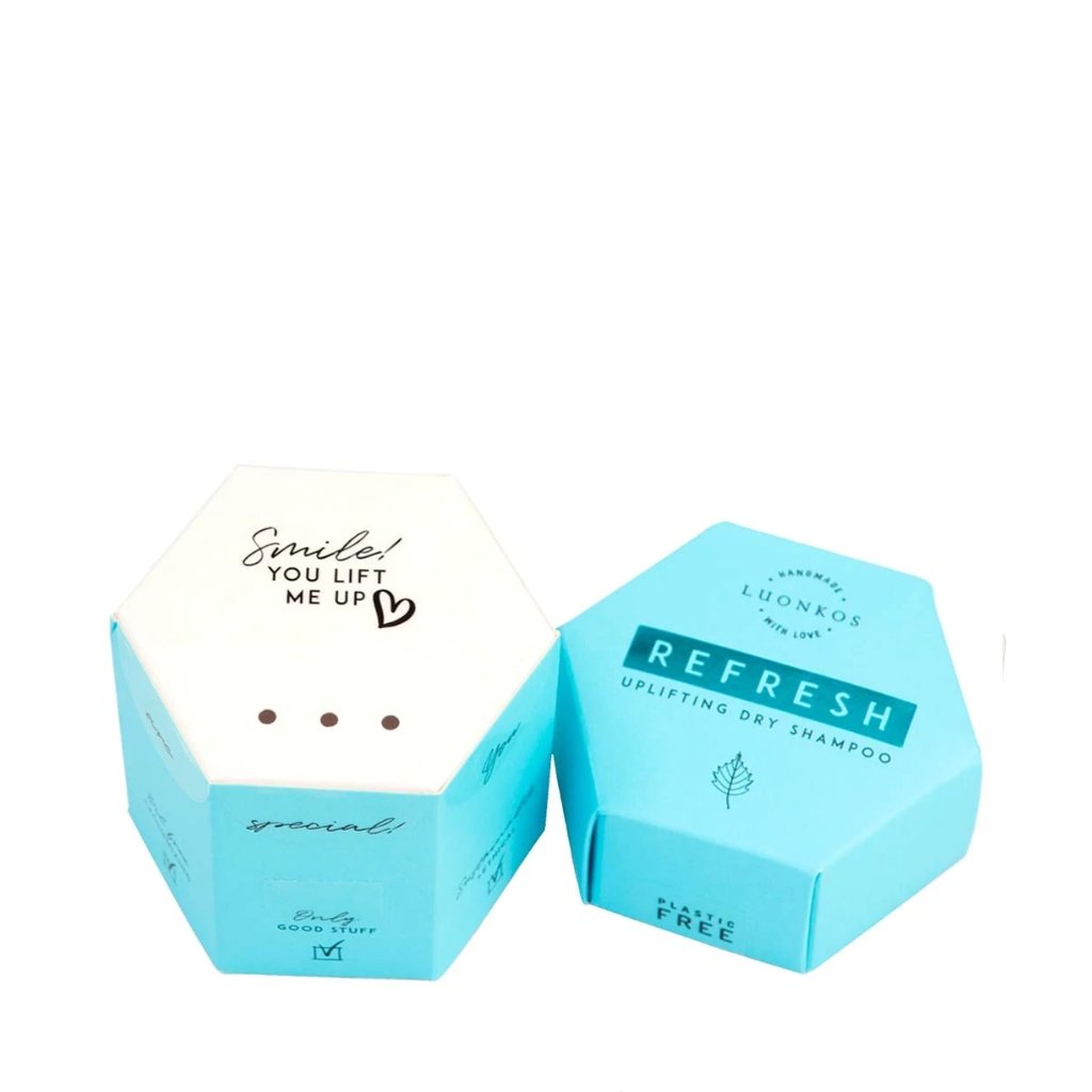 You can style your hair as you please with Refresh and you’ll get more support simply by adding more shampoo. Luonkos dry shampoo is packaged in a plastic free container where it can be conveniently sprinkled for use.